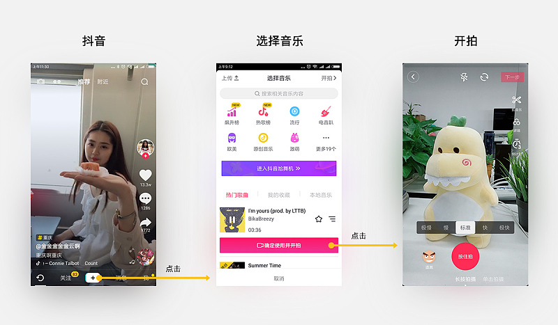 比起竞品,抖音引导用户使用音乐作为创作的基础,因为音乐能为视频内容指导主题和节奏,使创作难度大大降低。